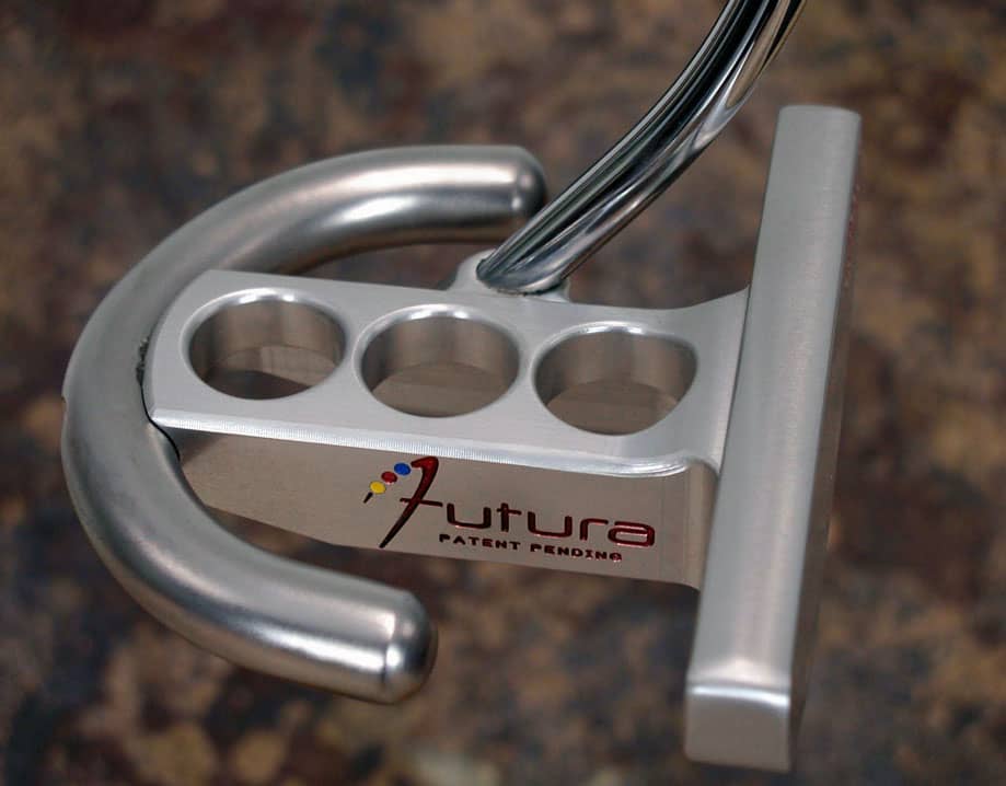 The Futura was in the prototype stage for years before it made its way into production. The Futura has a unique weight distribution with 75% of the weight being in the stainless “horseshoe” and 25% being in the face and body. This combination of balance allows the Futura to perform like no other putter we had ever tested. The ball rolls immediately off the face of the putter without ever digging into the green. The sole was designed so the putter never closes when setting up to the ball and the top-line is shaped for a contoured look. In late 2003, two sightlines were added to the top flange of the body for better visuals and ease of alignment. Finally, two plugs have been milled into the back of the face and stainless weights have been applied to create even more stability and give the putter that solid sound and feel. The Futura had its first win on the PGA Tour in 2003.